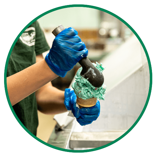 Picture the old, hand-crank ice cream machines in a bucket of ice. Now, instead of a hand-crank, we’ve got a motor that does the hard work for us, and instead of ice, we use the power of refrigeration. Milk, cream, and sugar are mixed together, along with your favorite flavors and mix-ins to create a tasty, creamy, cold, yummy treat.